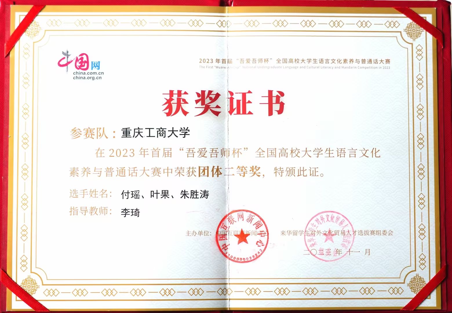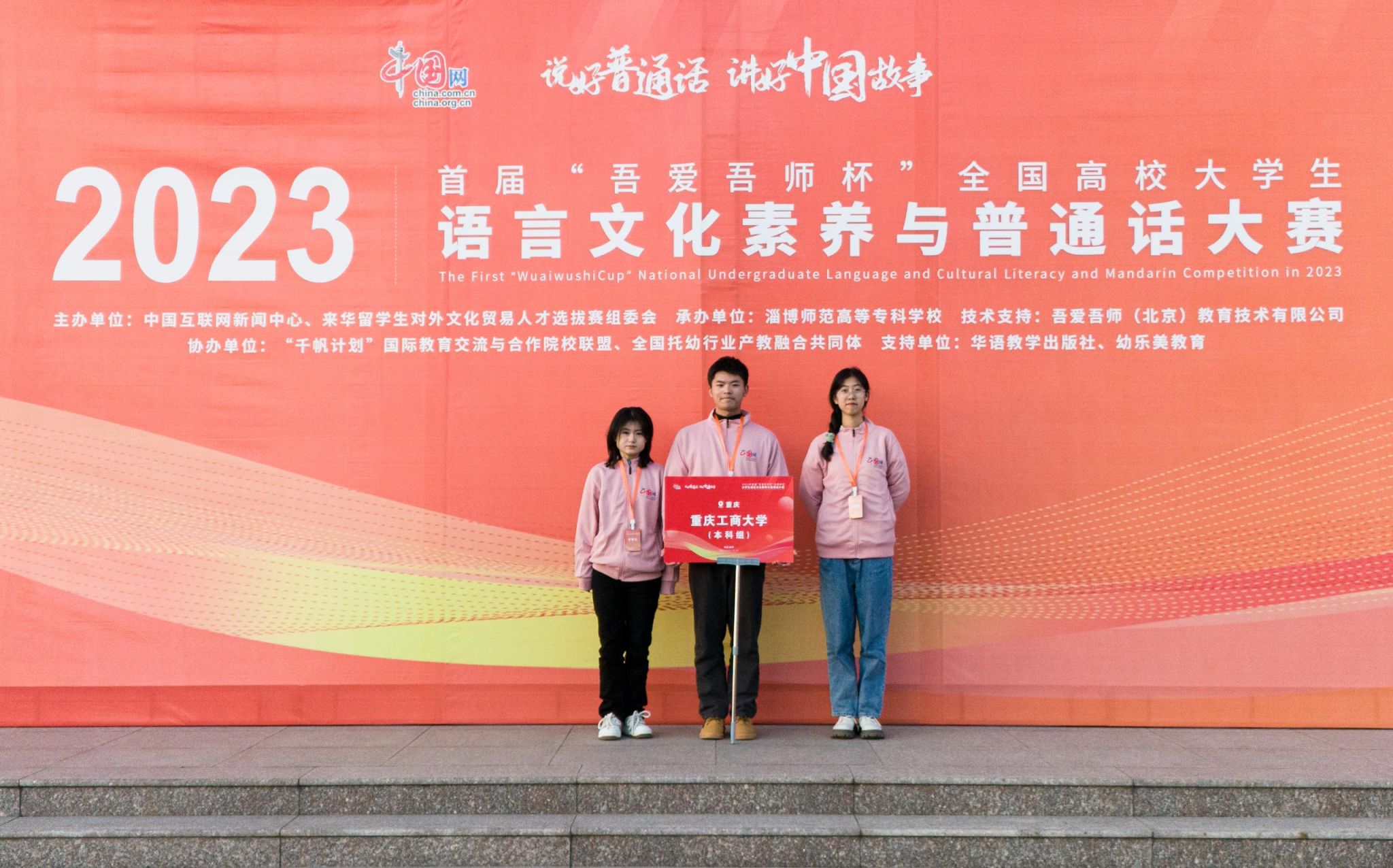 11月17日-19日,由中国互联网新闻中心、来华留学生对外文化贸易人才选拔赛组委会共同主办的首届“吾爱吾师杯”全国高校大学生语言文化素养与普通话大赛在山东淄博师范高等专科学校举行,beat365文学与新闻学院2021级叶果、朱胜涛同学与金融学院2022级付瑶同学在指导教师李琦老师的指导下,在大赛中获得全国总决赛(本科组)团体二等奖。