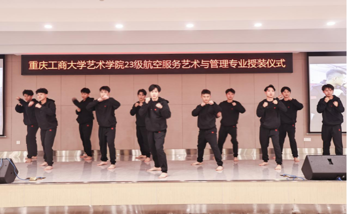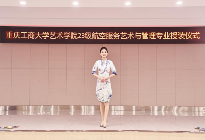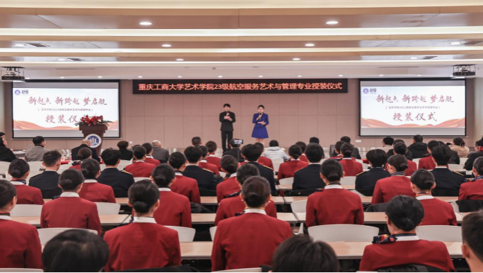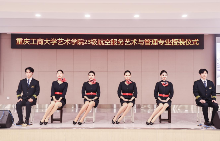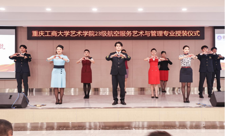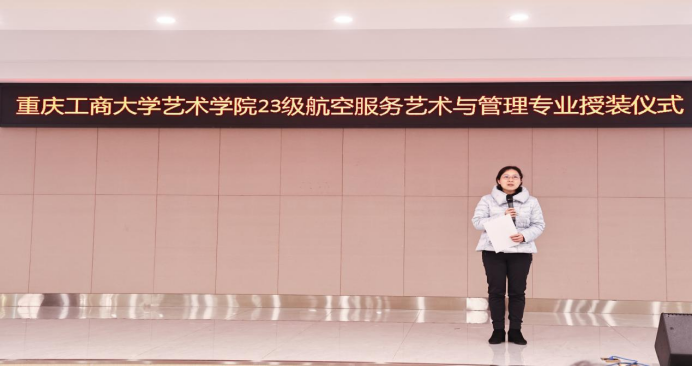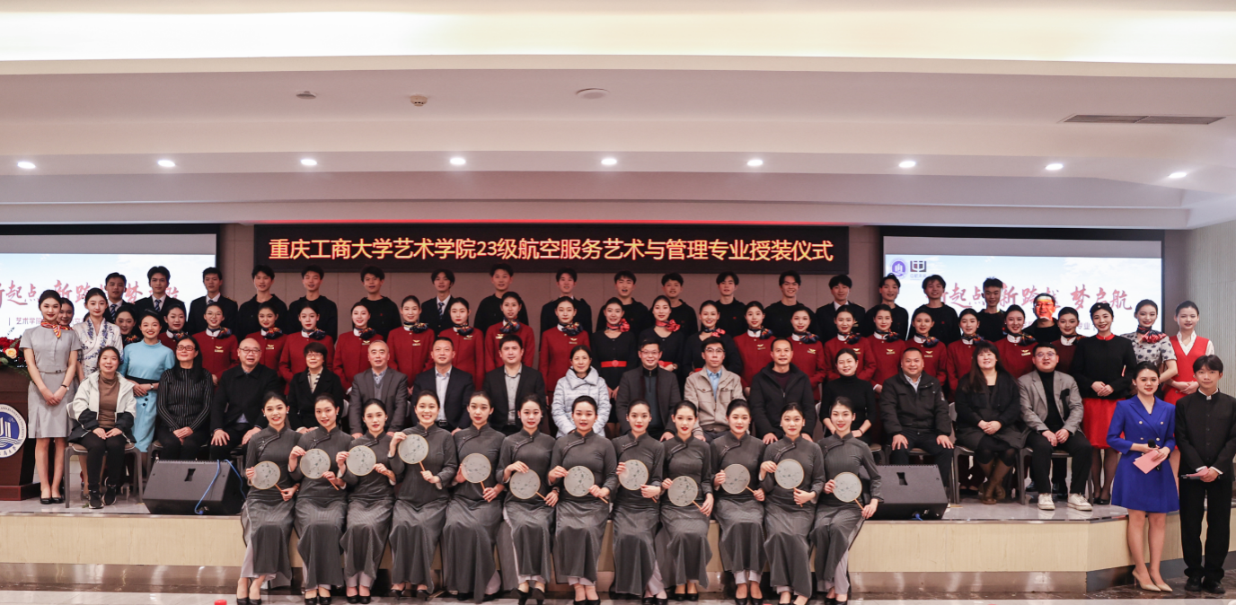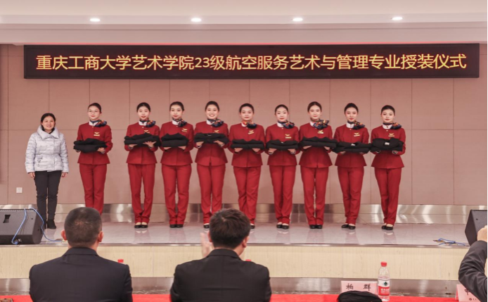 1月7日,艺术学院航空服务艺术与管理专业制服授装仪式在beat365在线唯一官网南岸校区学生就业指导中心报告厅举行。副校长柏群,北京中航未来教育集团董事长刘永、副总裁张鹏、教研总监张利,安徽云翔未来科技有限公司总经理彭春,党委学工部部长申卫东,国内合作发展处处长刘代成,教务处处长骆东奇,招生就业处处长钟增胜,财务处处长王燕,艺术学院党政领导、教师代表和全体2023级航空服务艺术与管理专业学生参加了活动。
