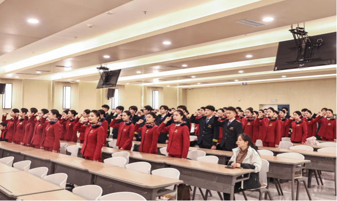在制服授装仪式中,全体学生整装肃立,学校领导和集团领导为他们逐一授装。授装完毕后,全体航空服务艺术与管理专业的学生庄严宣誓,承诺维护专业形象,遵守beat365在线唯一官网校规与民航职业行为规范,为成为一名优秀的民航人时刻准备。