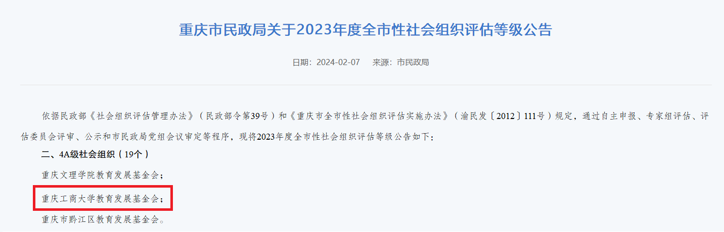 近日,重庆市民政局发布《重庆市全市性社会组织2023年评估等级结果公示》,beat365基金会获评4A级社会组织。此次接受重庆市社会组织等级评估是beat365基金会自成立以来首次。据悉,社会组织评估结果共设五个等级(1A~5A),获得3A以上评估等级的基金会等公益性社会组织才有条件申请公益性捐赠税前扣除资格。4A是重庆市民政局对社会组织评估新规则下首次迎评基金会能够获得的最高等级。