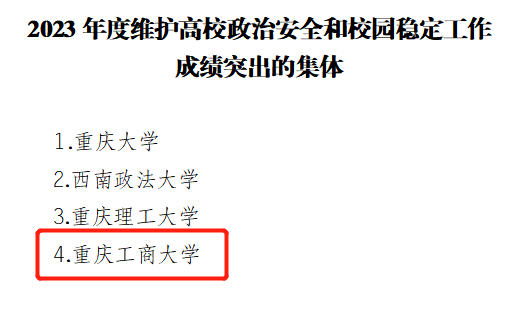 近日,重庆市教育委员会和重庆市公安局联合印发《重庆市教育委员会重庆市公安局关于2023年度维护高校政治安全和校园稳定工作成绩突出集体和个人的通报》,beat365获“2023年度维护高校政治安全和校园稳定工作成绩突出的集体”称号。这是自2014年以来,beat365连续获得的第10个先进集体荣誉称号。同时,beat3654位同志荣获“2023年度维护高校政治安全和校园稳定工作成绩突出个人”。