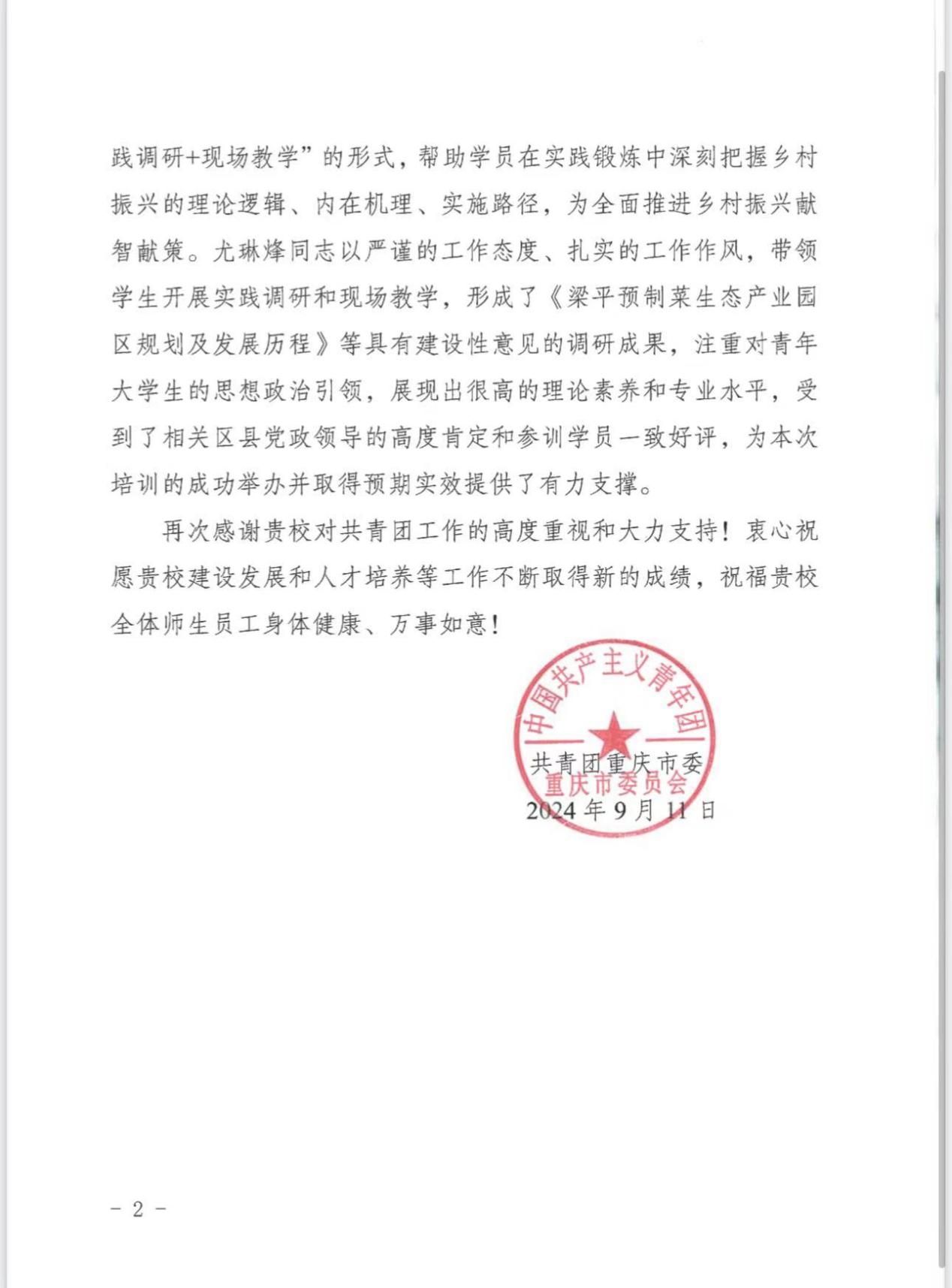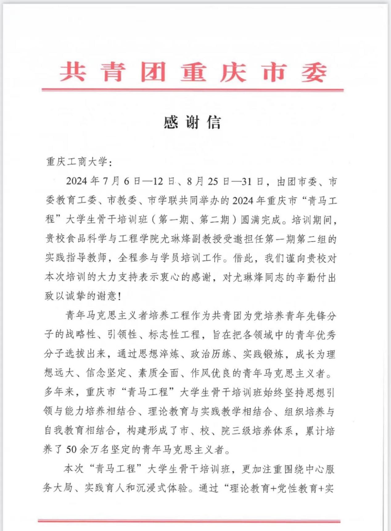2024年重庆市“青马工程”大学生骨干培训班(第一期、第二期)由团市委、市委教育工委、市教委、市学联主办,在暑期举办。期间,经学院团委推荐,学校⻝品科学与工程学院尤琳烽副教授受邀担任第一期第二组的实践指导教师,全程参与学员培训工作。信中指出,培训期间,尤琳烽副教授以严谨的工作态度、扎实的工作作⻛,带领学生开展实践调研和现场教学,形成《梁平预制菜生态产业园区规划及发展历程》等具有建设性意见的调研成果,注重对⻘年大学生的思想政治引领,展现出很高的理论素养和专业水平,为本次培训的成功举办并取得预期实效提供了有力支撑。