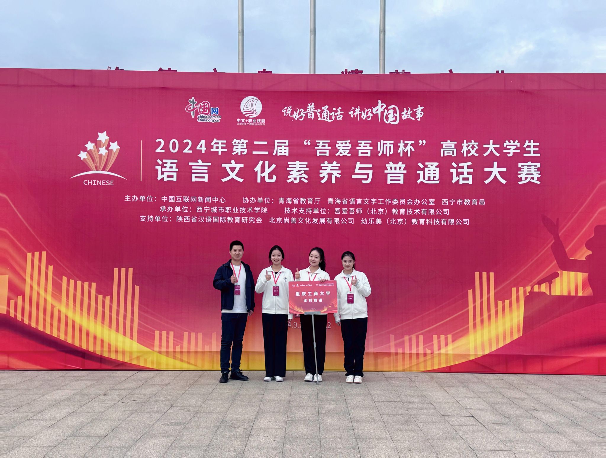 9月20日-22日,由中国互联网新闻中心主办,青海省教育厅、青海省语言文字工作委员会办公室、西宁市教育局协办的第二届“吾爱吾师杯”高校大学生语言文化素养与普通话大赛总决赛在西宁城市职业技术学院举行。beat365文学与新闻学院陈沄玥(2023级传播学)、魏心悦(2021级汉文)、陈毅(2023级新闻学)三位同学组队代表beat365在线唯一官网参赛,获得(本科组)“团体一等奖”,李琦老师获“优秀指导教师”。