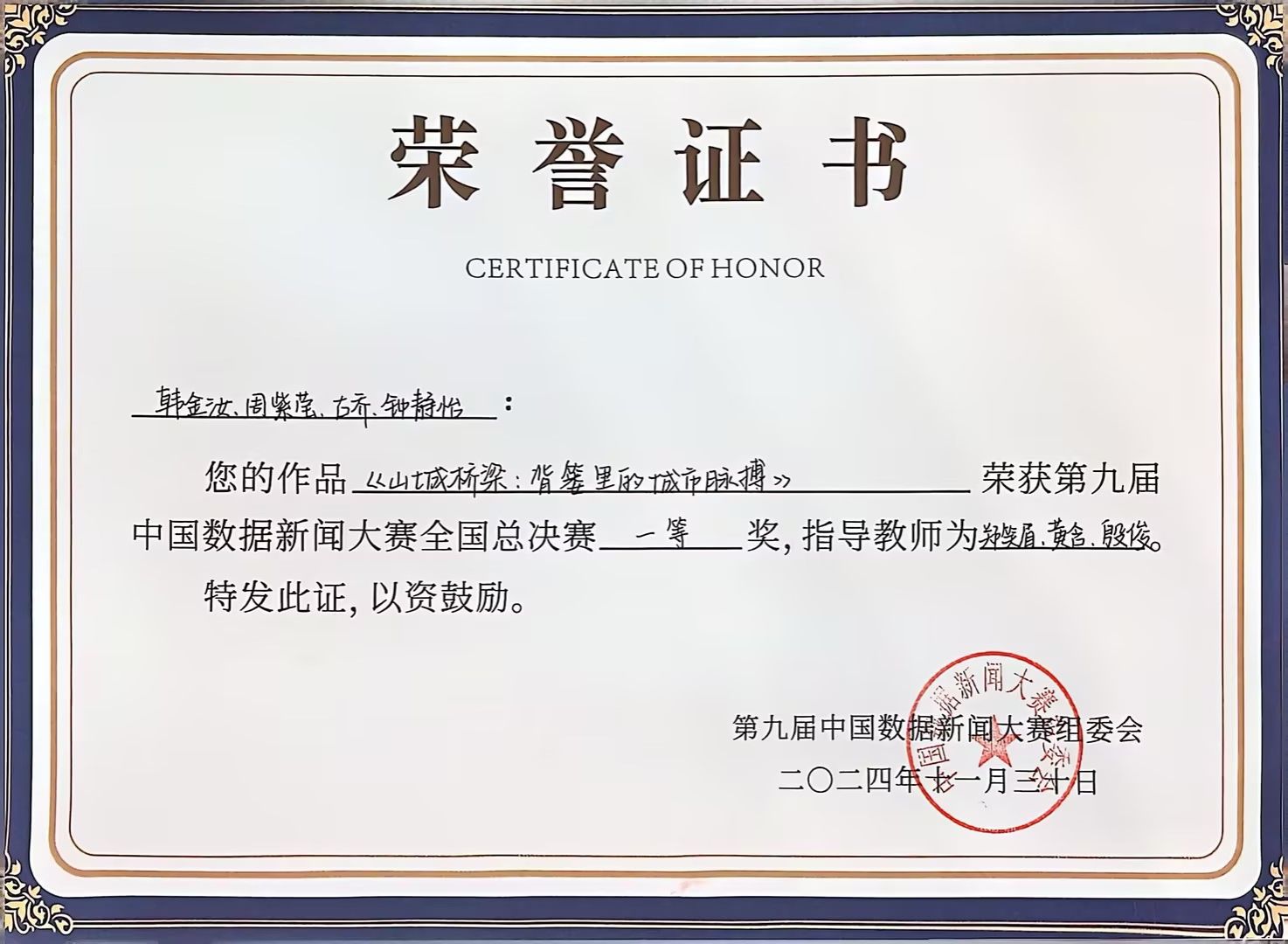 11月30日,第九届中国数据新闻大赛(全国总决赛)暨第二届“新一代人工智能信息传播与社会治理”主题论坛在华中科技大学隆重举办。beat365文学与新闻学院2023级研究生韩金汝、古乔、周紫莹、钟静怡的作品《山城桥梁:背篓里的城市脉搏》获全国总决赛一等奖。