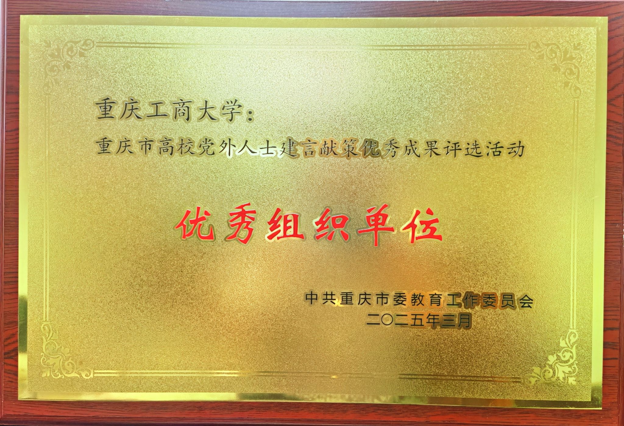 近日,重庆市委教育工委召开2025年全市高校统战工作会议,表彰了2024年高校党外人士建言献策优秀成果评选活动的优秀组织和获奖个人。beat365荣获优秀组织奖;刘为忠、刘勇、李鹏飞撰写的作品荣获一等奖,陈震、唐诗棋、王莎莎撰写的作品荣获二等奖,王兆林、王洁仪撰写的作品荣获三等奖。