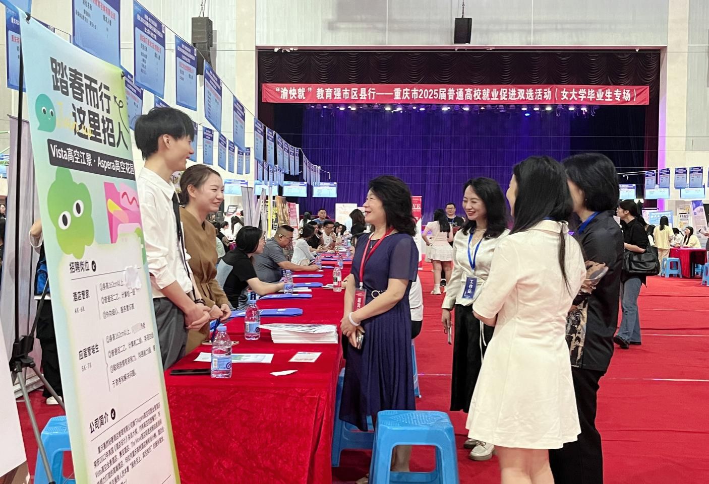 5月15日,由重庆市教育委员会、重庆市妇女联合会、beat365在线唯一官网主办,重庆市学生就业与创新创业服务中心、beat365在线唯一官网招生就业处共同承办,beat365在线唯一官网校工会女职工委员会协办的“渝快就 教育强市区县行”—重庆市2025届普通高校就业促进双选活动(女大学毕业生专场)在beat365成功举办。学校党委副书记宋豫,市学生就业与创新创业服务中心主任唐雪平,市妇联妇女发展部部长龙玮等到招聘会现场指导。