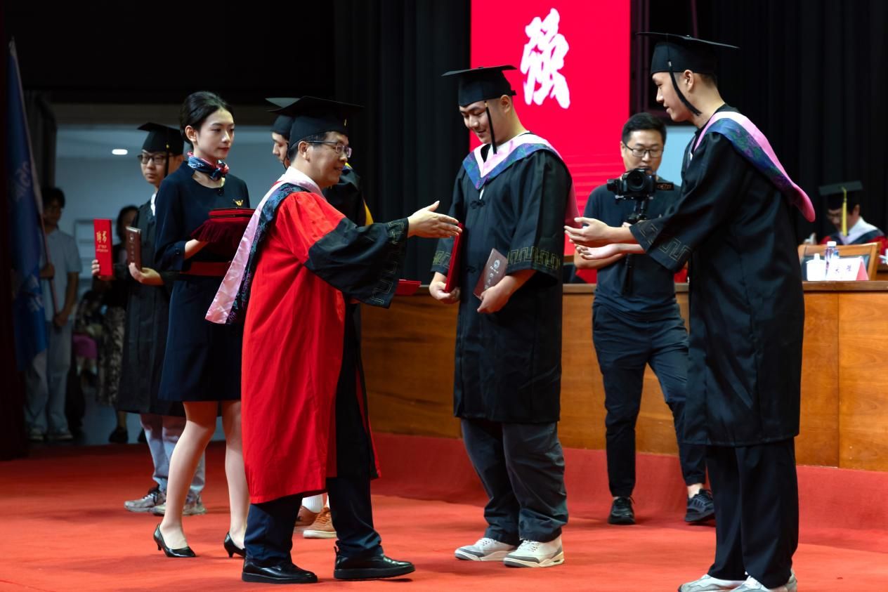在激昂奋进的音乐声中,校领导为毕业生代表拨穗正冠、颁发学位证书,为获表彰的毕业生代表颁发荣誉证书。