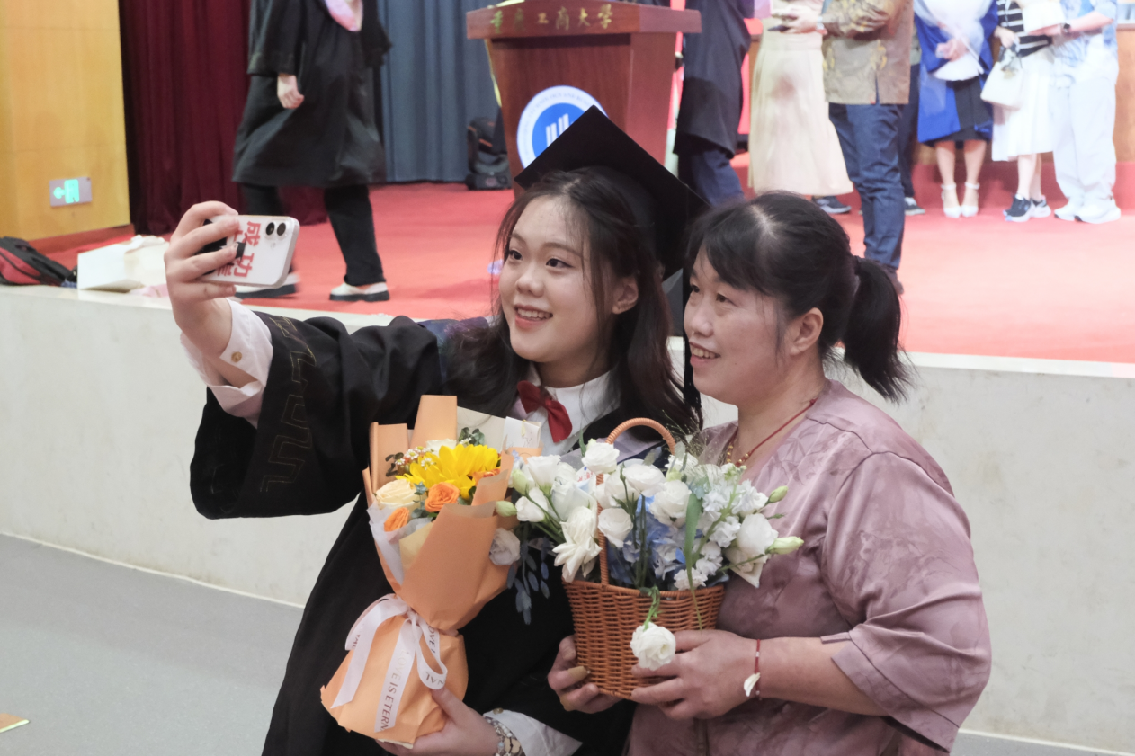 成长路上,父母如同无声的灯塔,用包容的目光照亮每一段旅程。毕业生代表为父母送上鲜花和拥抱,感恩父母的养育之恩。看着儿女学有所成,不少家长眼中噙满泪花,岁月在他们鬓角染上的霜雪、眼角刻下的纹路,此刻都成了爱的勋章。泪光与笑容交织中,那些未曾言说的深情,都化作了最动人的告白。