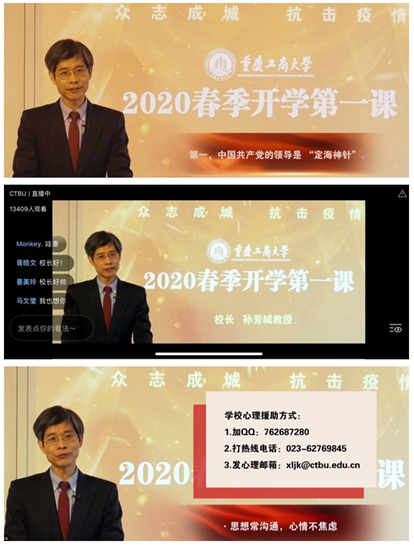 孙校长谈到了新冠肺炎疫情防控阻击战的责任与担当。第一,要强化责任担当,积极为战“疫”贡献力量。同学们遵守纪律,保护好自己和家人,就是为抗击疫情做贡献。第二,要立足自我管理,认真完成线上学习任务。孙校长提出了三点建议和要求。一是宅家不宅志,学业不停步。要发扬优良学风,展示新时代大学生良好的精神风貌和自主学习能力。二是学习不打折,课业不放松。要切实做到学习方式转换,确保学习质量不降。三是思想常沟通,心情不焦虑。要与老师和同学们保持密切联系,及时了解学校相关通知、要求。
