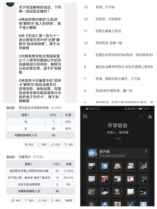 辅导员队伍于2月29日、3月1日召开线上主题班会,进行收心教育和学风动员,为学校在线教学进行“暖课”。各班级利用QQ、企业微信等平台对同学们当前的学习情况进行问卷调研,组织学习互助小组,督促同学们每天在线学习打卡,为家中备战法考资料不足的同学共享线上资料,并进行线上讨论和指导。同时,加强学生的心理辅导和心理建设工作,提醒同学们学习和防疫两不误,强调学习上有问题联系老师,生活上有需要找学院,帮助同学们解决实际困难。