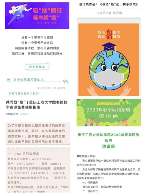 学院引导同学们结合专业将所学用于所思所想,保持专业敏感性,开展“与‘法’同行 笔书战‘疫’”原创网络文化作品征集活动,让同学们体悟到作为法学专业学生的社会担当。学院官方微信公众号开设“共同战疫”和“线上资源”栏目,尽可能回应现实问题,为同学们提供线上学习资源和就业信息。