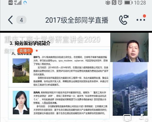 商务策划学院高度重视研究生招生宣传工作,在当前疫情防控的特殊背景下,想方设法利用网络新媒体扩大学院的2021年研究生招生宣传。2020年4月11日上午,学院与河南师范大学商学院合作开展了考研宣讲会。会议由主管研究生教育的副院长詹川主持,研究生秘书吕远飞老师、2017级研究生李肖依同学参加了宣讲会。