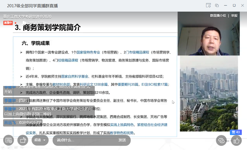 此次宣讲会经过数次与河南师范大学辅导员李建华老师沟通、协调得以如期举行。宣讲会通过钉钉直播的形式进行,河南师范大学商学院2017级、2018级部分未来有意考研的同学共600余人参与了此次直播。詹川首先介绍了重庆作为西部地区唯一的直辖市所具有的地域特点及发展优势,并对beat365在线唯一官网的办学规模、研究生师资及研究生培养情况作了简要介绍。接着,詹川详细介绍了商务策划学院企业管理及技术经济及管理学术硕士、国际商务专业硕士的专业设置、办学特点、师资力量、培养模式、学生就业以及奖助体系等情况。随后,学院2017级技术经济及管理专业研究生、河南师范大学校友李肖依同学,分享了她的考研历程及读研期间的个人感悟和收获。此次线上宣讲会还对2021年有意报考beat365在线唯一官网硕士研究生的同学们进行答疑解惑,以便同学们更加了解beat365,认识当前考研形势,以及制定切实有效的考研计划。