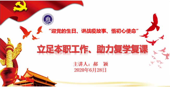 首先,郝颖同志讲了一堂题为“立足本职工作,助力复学复课”的党课。她讲到,中国战“疫”积累起来的经验做法总结起来就是“战‘疫’中国策九字诀”。同时,她分享了疫情防控期间为了助力复学复课,经济学院学工队伍每天关注学生动态和健康数据上报,做好学生复课的各项服务工作,自己临危受命从今年1月28日起组织心理氧吧工作室成员开通线上心理咨询,服务了135位同学,及时干预了3起严重心理危机;学院办公室积极加强教师线上办公技能培训,全力为师生线上教学服务等。