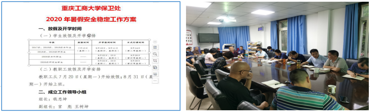 为圆满完成暑期校园封闭式管理和安全稳定工作,根据7月16日学校第五次中层干部会议精神和《关于2020年暑假放假及开学安排的通知》安排,按照分管校领导的要求,保卫处高度重视,提前制定了《beat365在线唯一官网保卫处2020年暑假安全稳定工作方案》,细化了《beat365在线唯一官网保卫处2020年暑期值班安排表》,并于7月17日上午召开全处干部大会,对暑期校园疫情防控和安稳工作进行了周密部署。