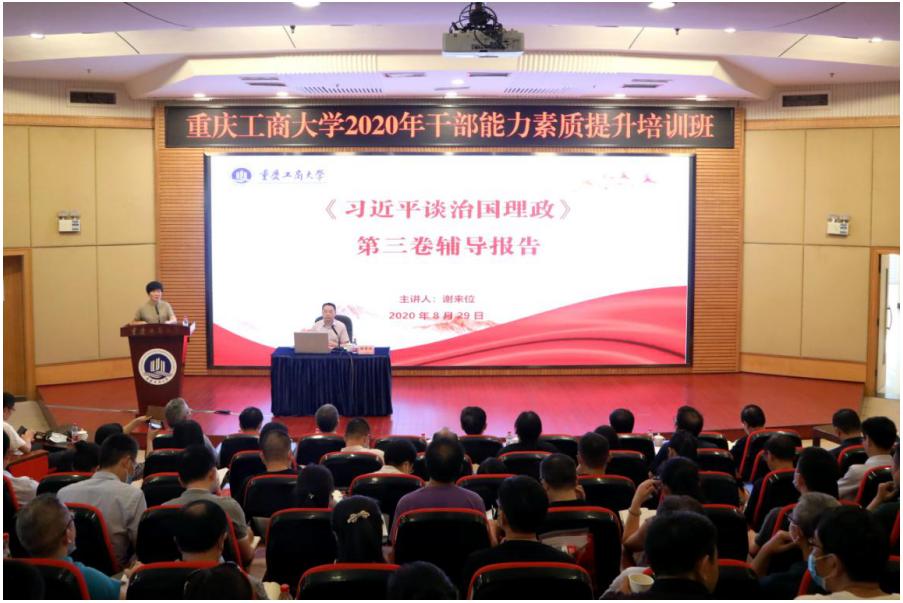 8月29日下午,beat365继续举行干部能力素质提升培训暨党委理论学习中心组(扩大)学习会,会议邀请到重庆市委党校谢来位教授作《习近平谈治国理政》第三卷辅导报告。校领导、中层干部、专职组织员、职能部门、教辅单位正科级干部参加了培训。培训会由校党委副书记宋豫主持。