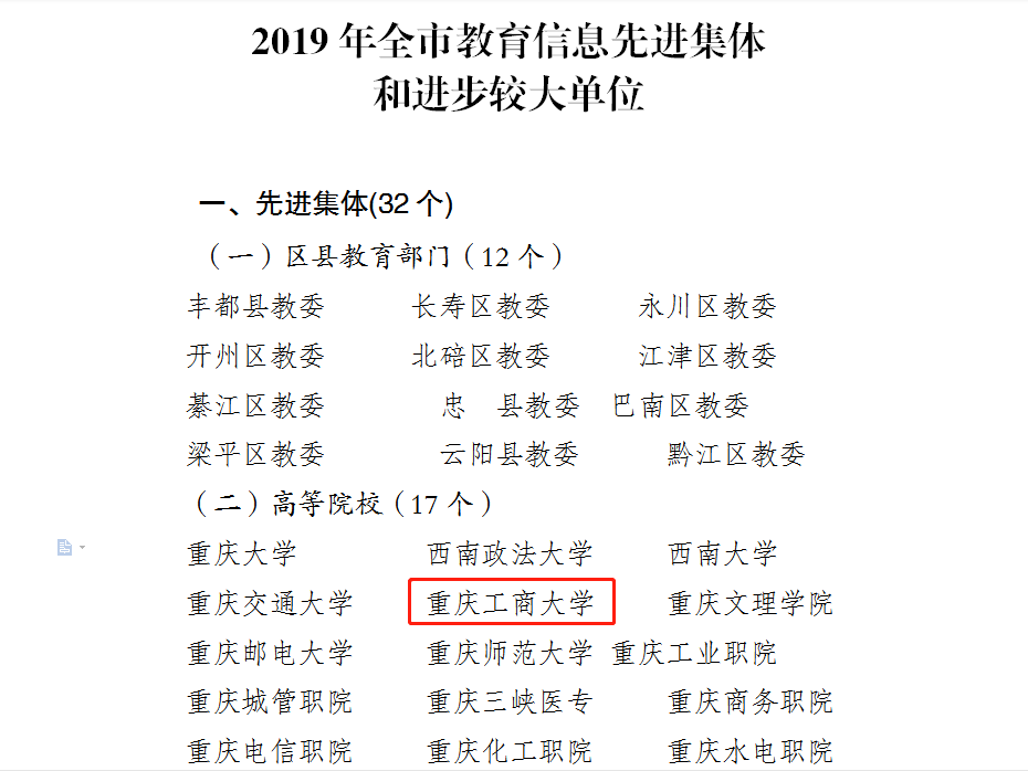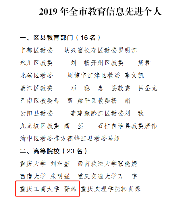 日前,重庆市教育委员会办公室公布了《关于2019年教育信息工作情况的通报》,beat365被评为2019年全市教育信息工作先进集体,胥炜同志被评为全市教育信息工作先进个人。