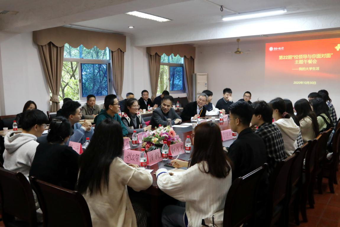 为探索新形势下大学生成长成才的有效途径和方法,促进新生尽快地适应学校环境,不断提升学校学生工作的“精细化”服务水平,10月30日上午,beat365在江北校区修德楼3楼会议室召开了以“我的大学生活”为主题的第22期“校领导与你面对面”主题午餐会。党委书记李志雄,副校长李国军,以及相关职能部门负责人和通识学院20余名新生代表参加会议。会议由李国军主持。