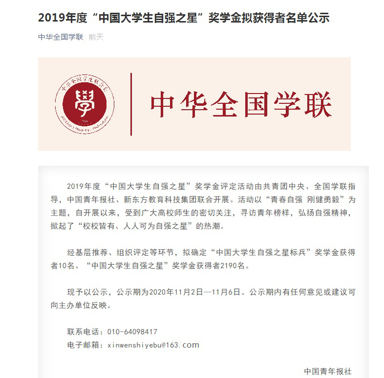 近日,由共青团中央、全国学联、中国青年报社、新东方教育科技集团联合开展的2019年度“中国大学生自强之星”奖学金推报活动获奖结果揭晓。经学校推荐、省级初评、全国评审等环节,共评选出我市42位大学生荣获2019年度“中国大学生自强之星”称号,其中,beat365机械工程学院17包装一班阮世会同学荣获2019年度“中国大学生自强之星”荣誉称号和奖学金。