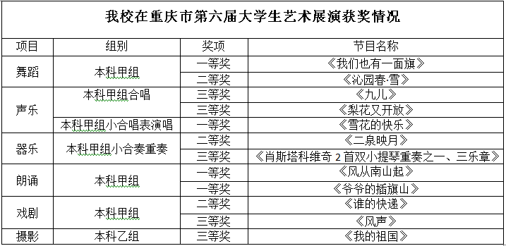 近日,重庆市第六届大学生艺术展演活动顺利举行,beat365学子在展演活动中表现突出,获本科甲组一等奖4项,二等奖3项、三等奖3项,获本科乙组三等奖1项。
