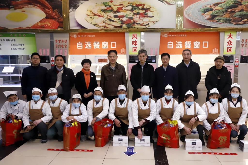 随后,校领导一行看望慰问北区学生公寓、保卫处以及兰园食堂的工作人员,并与他们亲切交流,了解寒假期间各个部门的工作安排情况,嘱咐相关部门要做好值班人员的生活保障。李志雄强调,学校寒假期间的疫情防控、安保及后勤工作依然非常重要,一定要高度重视。他希望大家继续发扬奉献精神,坚守岗位,齐心协力切实抓好假期疫情防控工作,落实校园防火、防盗等各项安全防范措施,为留校学生提供好后勤服务,以高度的责任心和使命感落实好值守工作任务,确保寒假和春节期间校园的安全稳定和后勤保障。