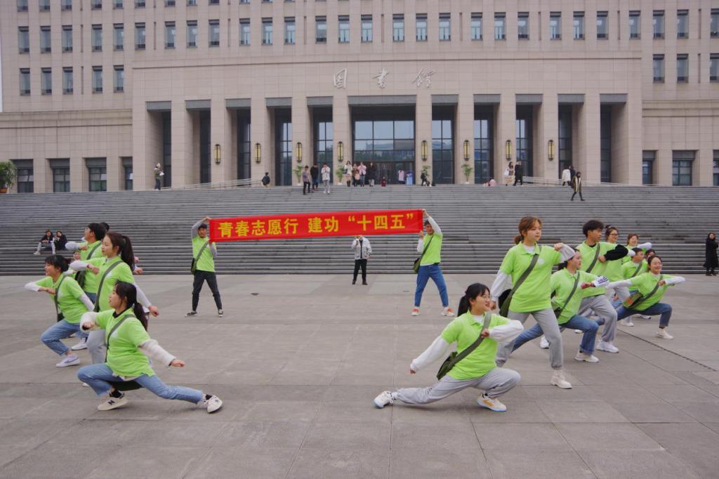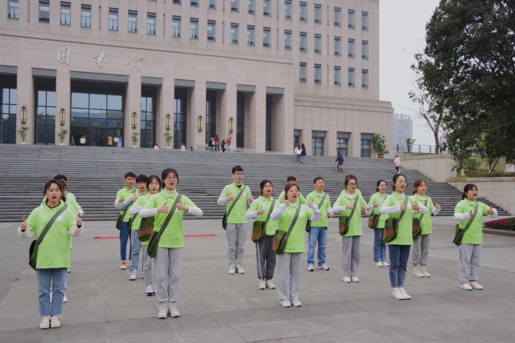 校前广场上,身着统一服装,背着“为人民服务”绿色挎包的志愿者们从人群中走出来,排列成整齐的队行,大声唱响《学习雷锋好榜样》的歌曲,熟悉的旋律,嘹亮的歌声,一下子吸引了广场上的师生。志愿者们用精彩的表演带领大家一起歌唱,让青春、激情、奋斗的热情一下子点燃了重工商大校园。 “青春志愿行,建功‘十四五’”,集结的号角,嘹亮的口号,大学生们用他们喜欢的方式和热情向雷锋致敬,向时代宣誓。