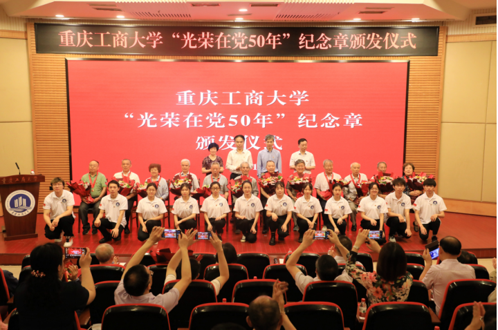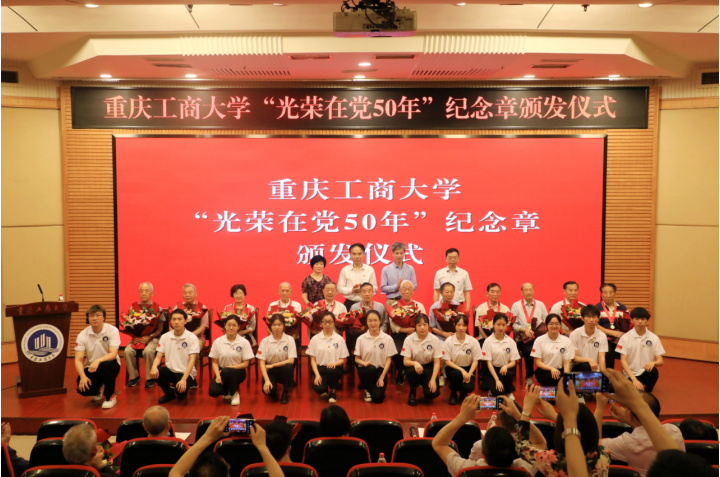 纪念章颁发仪式在庄严的国歌声中拉开序幕。校领导为36名“光荣在党50年”党员代表颁发纪念章,新党员为老党员献鲜花致敬。