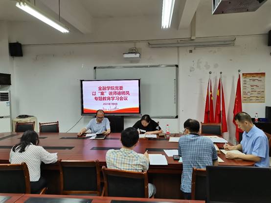 根据学校教师思想政治建设暨师德专题教育启动会工作部署,为进一步贯彻落实师德师风教育任务,全面提高教职工履职尽责的能力,努力打造高素质的专业教师队伍,近日,金融学院党委分别召开党委会和教职工大会就师德师风建设进行专题学习。金融学院党委书记、副院长王建明,党委副书记、院长王兰,党委副书记、纪委书记余新,党委委员、副院长庞楷、王韧和党委委员、专职组织员赵甫刚参加了会议。会议由王兰主持。