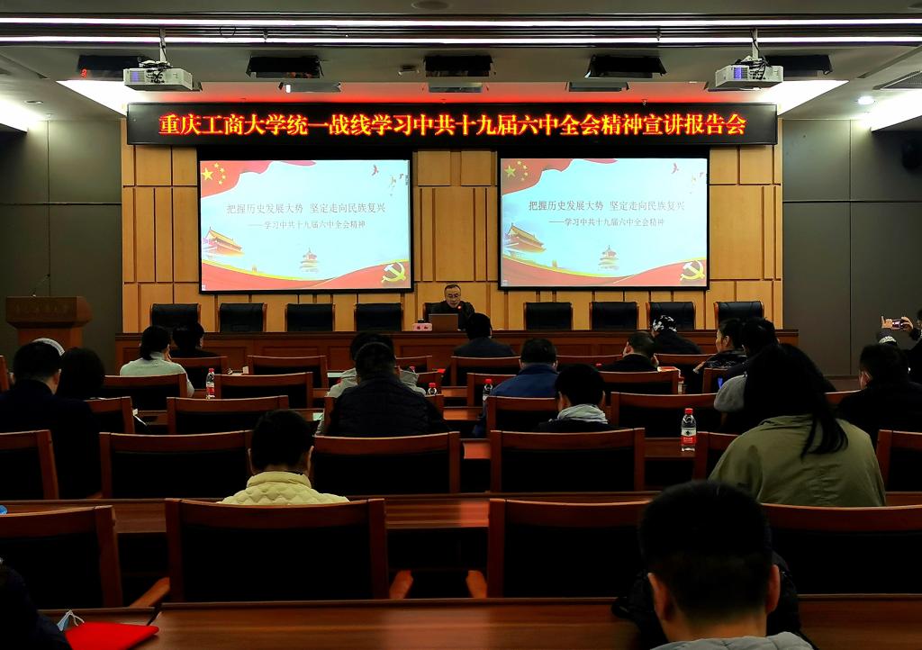 根据学校党委印发的《beat365在线唯一官网关于学习宣传贯彻党的十九届六中全会精神深化拓展党史学习教育的工作方案》的安排,结合学校统一战线开展“学党史、讲《条例》、增合力、促发展”大走访大谈心活动,12月8日下午,学校党委统战部在新图书馆会议中心一会议室举办统一战线学习中共十九届六中全会精神宣讲报告会,各民主党派基层组织和统战团体班子成员及统战成员代表共计50余人参会。