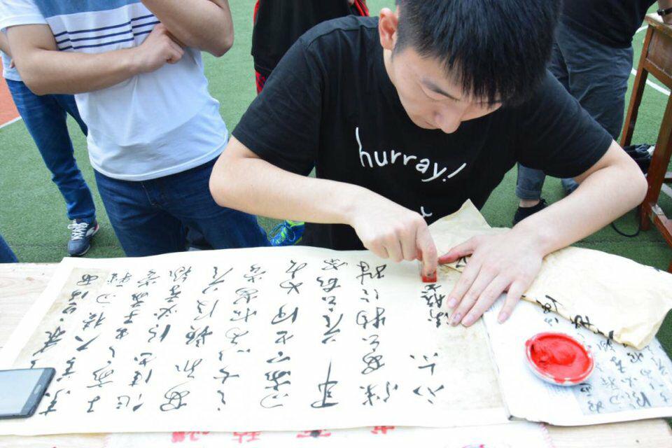 2017年5月12日下午,beat365在线唯一官网的绿茵场显得格外清爽,今天的绿茵场并非一个体育竞技场,而是一个挥毫泼墨的书法比赛现场。